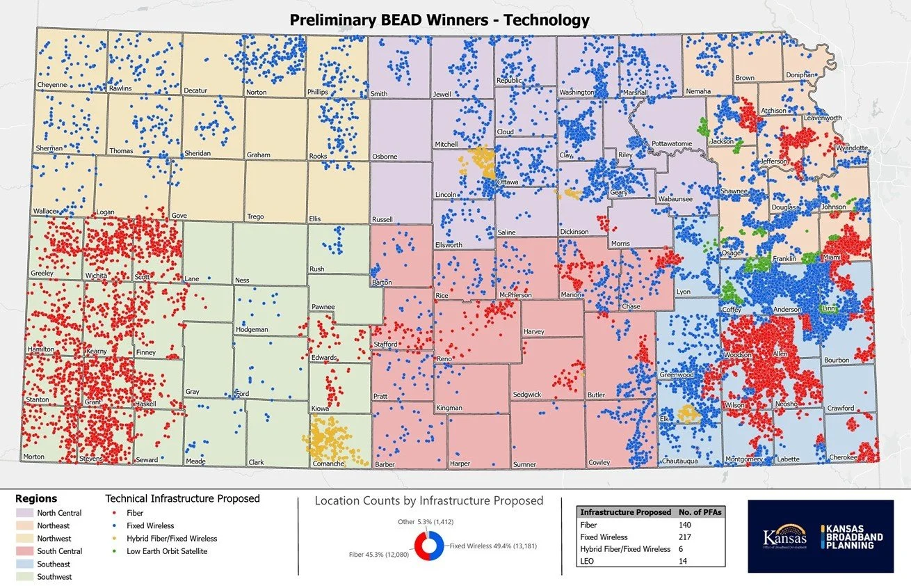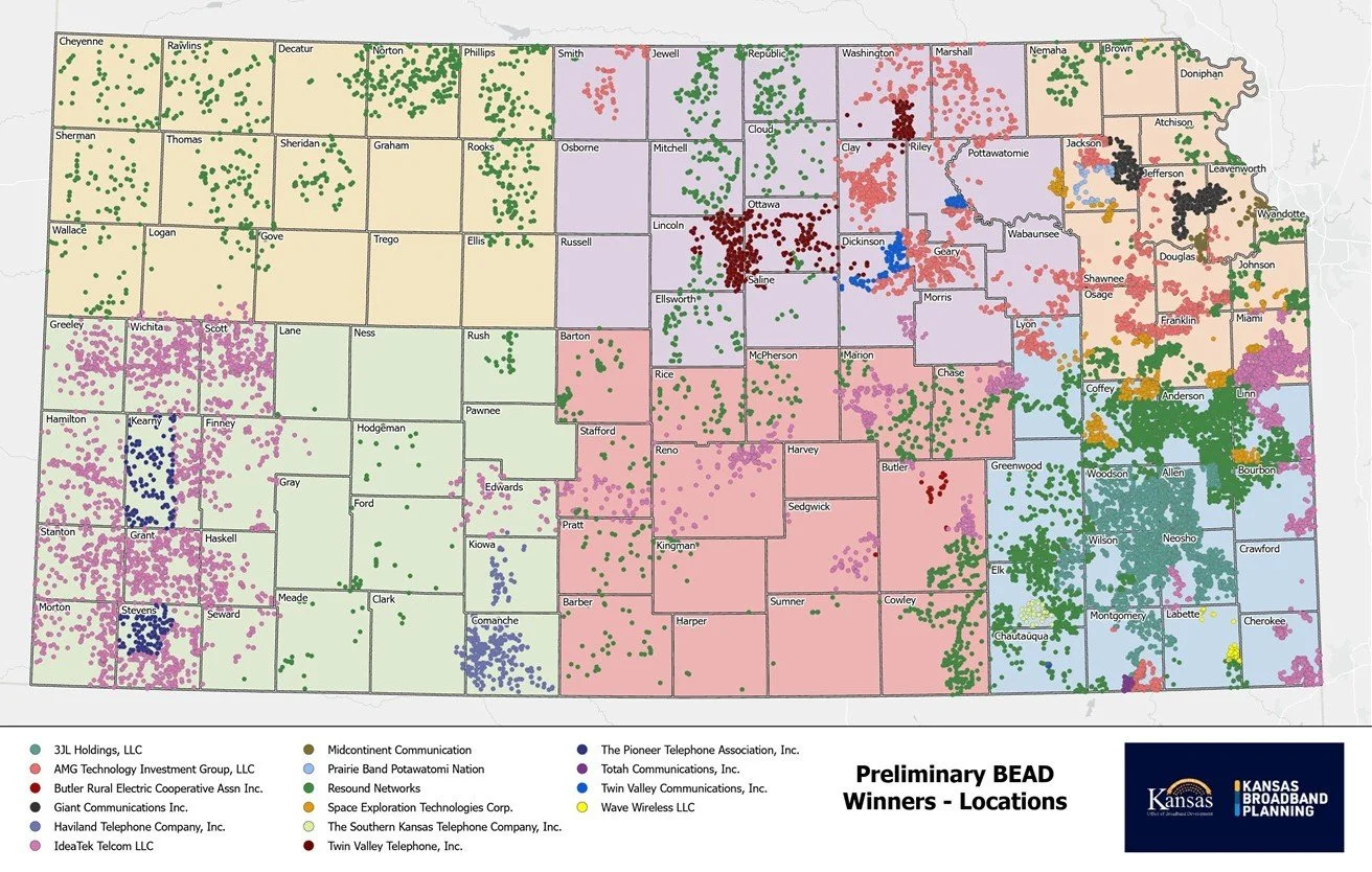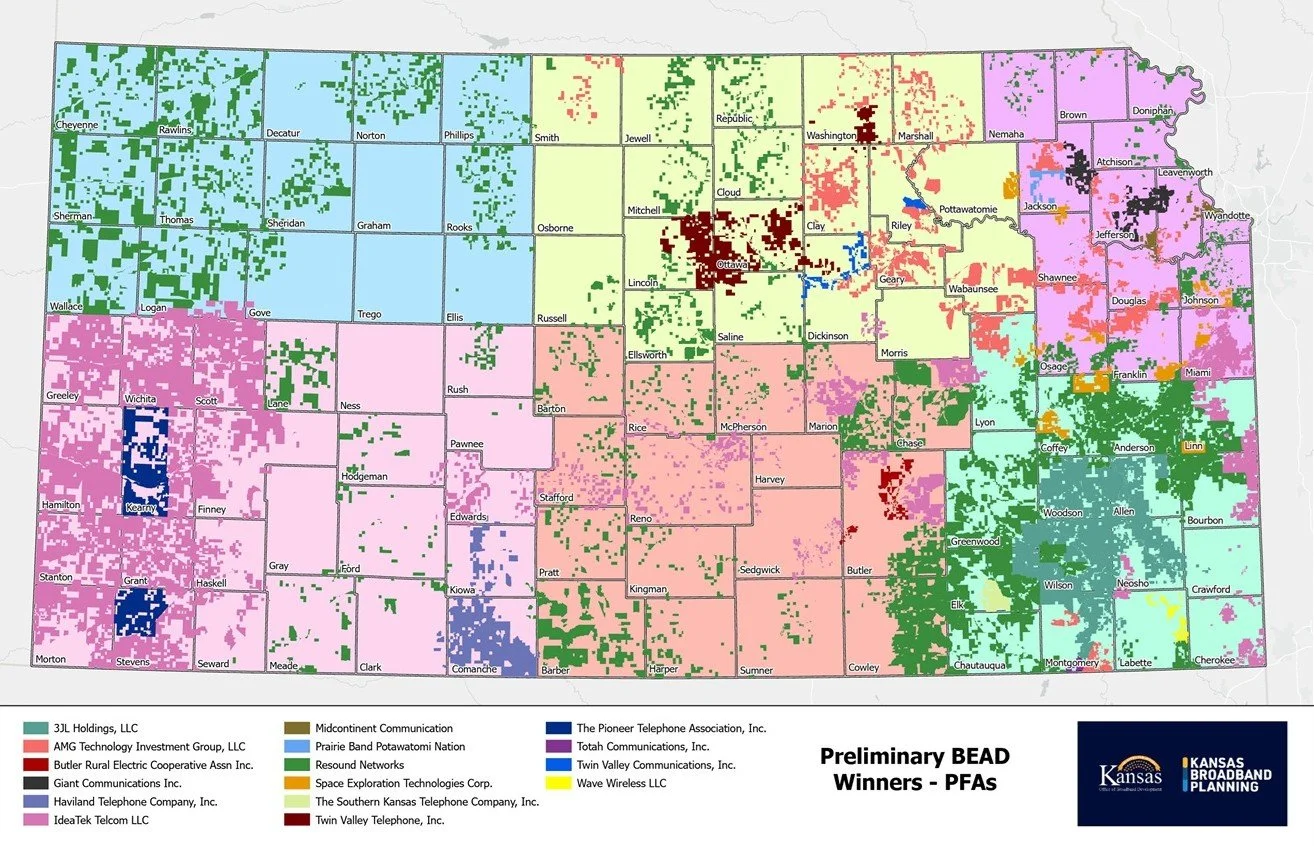 August 25, 2025 – The Kansas Office Of Broadband Development (KOBD) has announced the preliminary selection of Broadband Equity, Access, and Deployment (BEAD) Program “Benefit of the Bargain Round” awardees. The awards are not final until the National Telecommunication Information and Administration (NTIA) approves KOBD’s Final Proposal. Below are the key details of the Kansas BEAD Program awards: