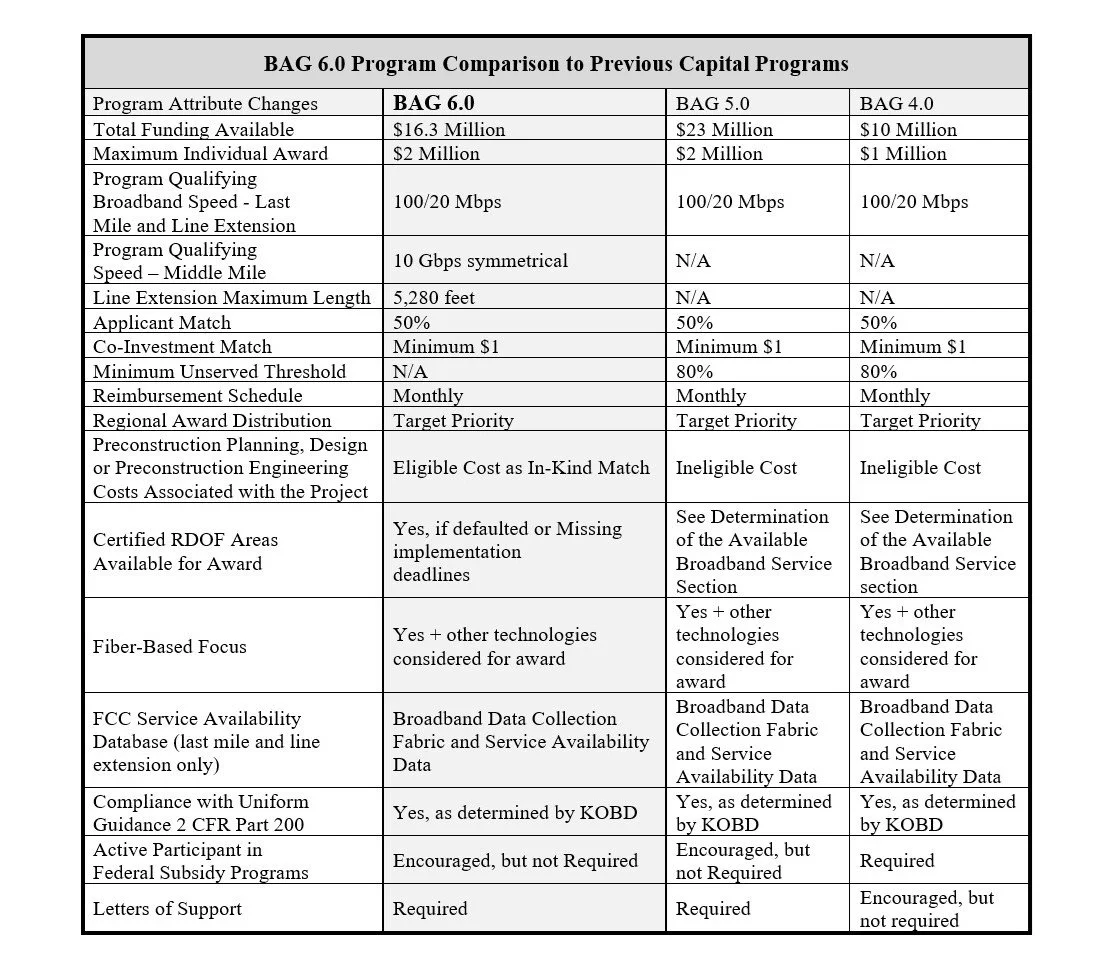 April 22, 2026 – The Kansas Office of Broadband Development (KOBD) has announced the next round of the Broadband Acceleration Grant (BAG) program – BAG 6. This new iteration of BAG will consist of $16.3 million in funding to improve broadband infrastructure using three distinct funding categories: (1) Last Mile; (2) Line Extension; and (3) Middle Mile. KOBD will make individual awards of up to $2 million for projects that expand access to high-quality, reliable broadband, with priority given to unserved areas, economically distressed communities, and locations of compelling need. There will be a 50% applicant matching funds requirement. Below is a table showing the details of BAG 6, along with details from BAG 5 and BAG 4 for comparison purposes.