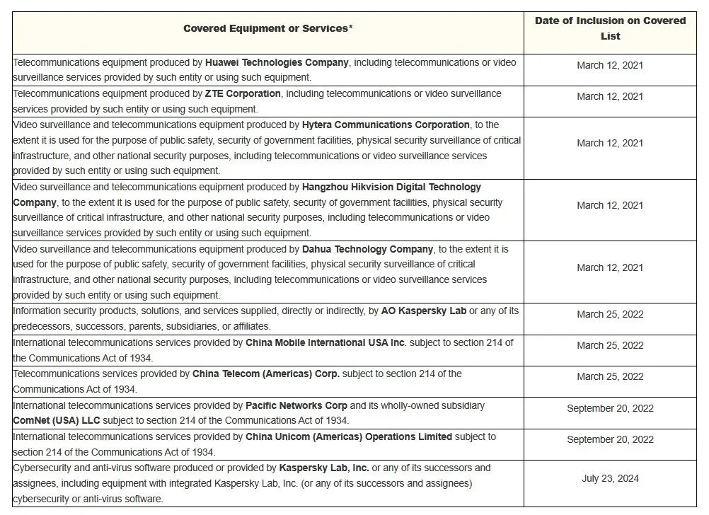 March 21, 2025 – Federal Communications Commission Chairman Brendan Carr has announced that the FCC’s Council on National Security has launched an investigation into the ongoing U.S. operations of CCP-aligned businesses whose equipment or services are on the FCC’s Covered List. Entities on the Covered List have been deemed to pose an unacceptable risk to the national security of the U.S. or the security and safety of U.S. persons. According to the announcement, the FCC believes some or all of the CCP-aligned businesses may still be operating in the U.S. The FCC has sent Letters of Inquiry and at least one subpoena to the entities to assess their current levels of operation and determine what further actions is necessary. The Covered List entities targeted in the investigation are: Huawei Technologies Company, ZTE Corporation, Hytera Communications Corporation, Hangzhou Hikvision Digital Technology Company, Dahua Technology Company, China Mobile International USA Inc., China Telecom (Americas) Corp., Pacifica Networks Corp./ComNet (USA) LLC, and China Unicom (Americas) Operations Ltd. The full Covered List is below.