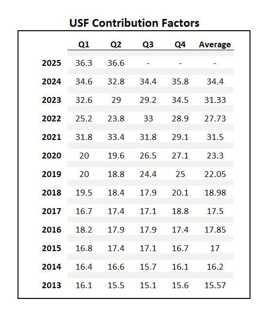 The 36.6 percent contribution factor for 2Q 2025 sets another new record, beating the previous all-time high of 36.3 percent during 1Q 2025. There has now been an increase to the USF contribution factor for four consecutive quarters (2Q 2024 – 32.8%; 3Q 2024 – 34.4%; 4Q 2024 – 35.8%; 1Q 2025 – 36.3%; 2Q 2025 – 36.6). Historical information on quarterly universal service fund contribution factors is available online from the FCC.