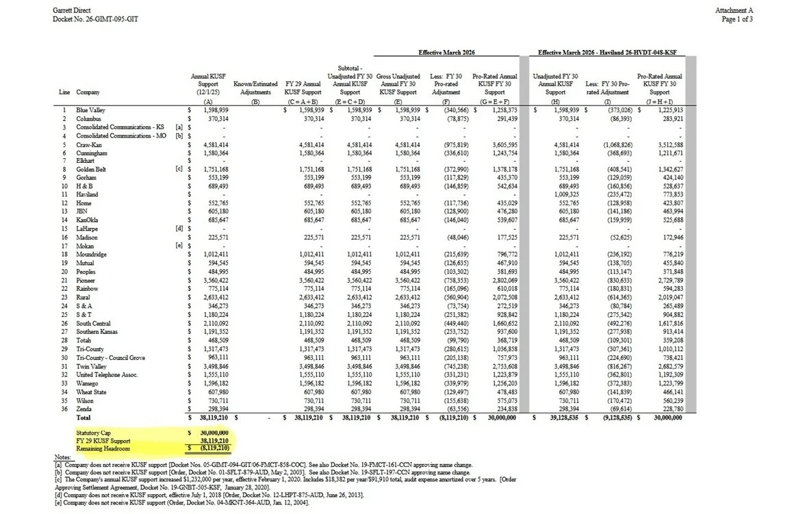 Additionally, the KCC has issued an Order adopting KUSF pro-rata support reductions for Kansas Rural Local Exchange Carriers (RLECs). Total KUSF support for RLECs is capped at $30 million, resulting in each RLEC’s being reduced on a pro-rata basis every year. Each RLEC’s revised pro-rata KUSF support reduction, monthly KUSF support, and cumulative annual KUSF FY 30 support is provided in Attachment A to KCC staff’s February 17th Report And Recommendation.