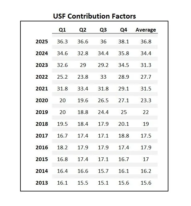 The 38.1 percent contribution factor for 4Q 2025 is a new all-time high. The average USF contribution factor for 2025 rounded up to the nearest tenth of one percent is 36.8 %. This is an all-time high for the average annual contribution factor. Historical information on quarterly universal service fund contribution factors is available online from the FCC.