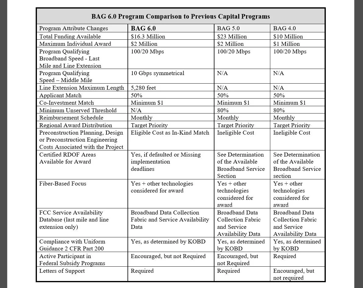 April 22, 2026 – The Kansas Office of Broadband Development (KOBD) has announced the next round of the Broadband Acceleration Grant (BAG) program – BAG 6. This new iteration of BAG will consist of $16.3 million in funding to improve broadband infrastructure using three distinct funding categories: (1) Last Mile; (2) Line Extension; and (3) Middle Mile. KOBD will make individual awards of up to $2 million for projects that expand access to high-quality, reliable broadband, with priority given to unserved areas, economically distressed communities, and locations of compelling need. There will be a 50% applicant matching funds requirement.